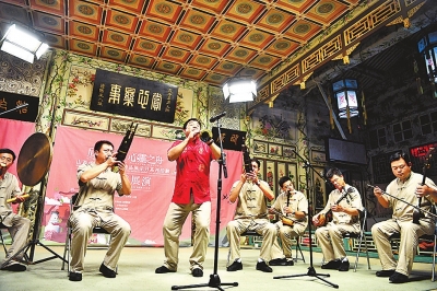 7月22日,非遺傳承人杜杏栓(右五)吹奏嗩吶。當日,“山西忻州文化遺產精品展示月”系列活動在北京恭王府開幕。新華社發(fā)